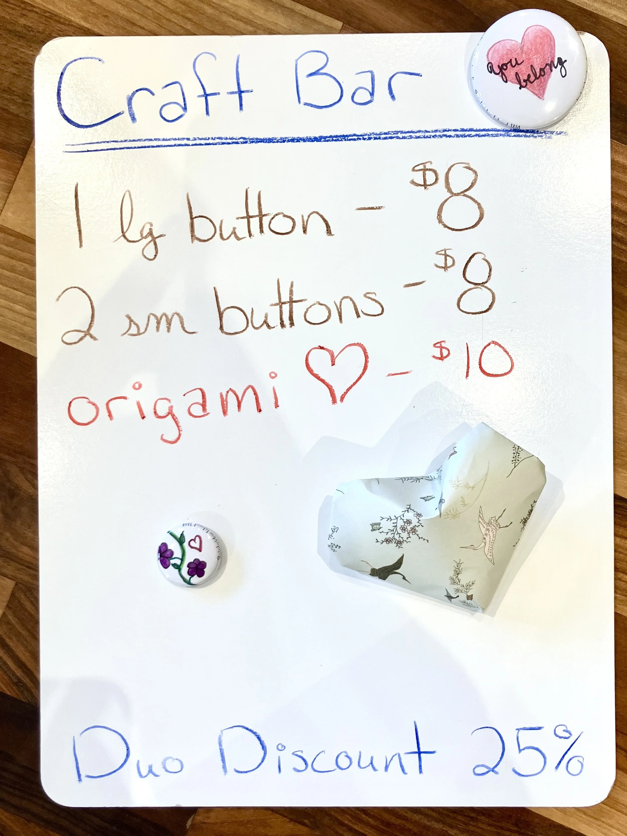 Coming in with a friend? the Duo Discount is 25% off for the second person! Perfect for crafting with friends, Big/Little time, or a casual date.